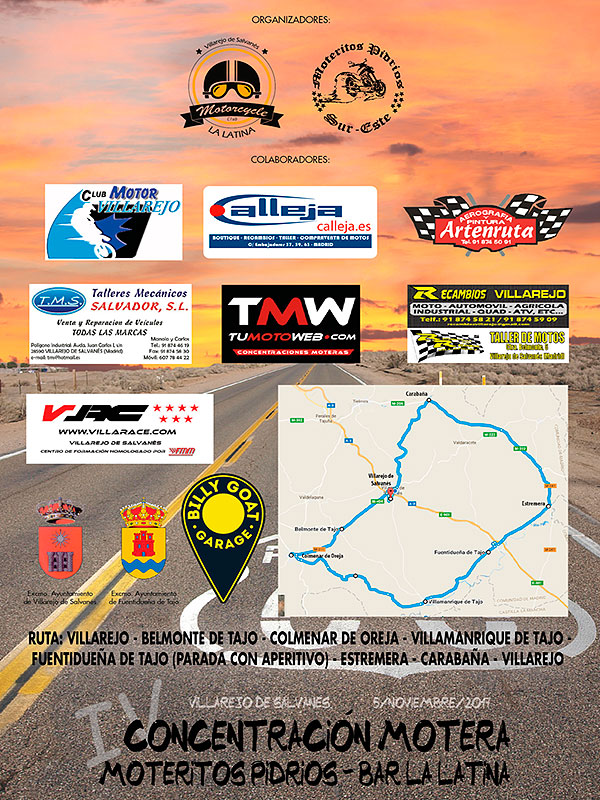 Domingo 5 de Noviembre: 9:00h Apertura de inscripciones (5 €) limitadas hasta fin de existencias. Desayuno. 10:30h Salida ruta Villarejo de Salvanés, Belmonte de Tajo, Colmenar de Oreja, Villamanrique de Tajo, Fuentidueña de Tajo (para con aperitivo en los bares), Estremera, Carabaña y regreso a Villarejo de Salvanés. 13:30h Exhibición a cargo de Sayan Stunt (componente de Loca Academia de Policía del Parque Warner Madrid). Matinée motera a cargo de Carlitos Salas. Comida y sorteo de regalos + 3 entradas dobles para el GP Comunidad Valenciana de MotoGP. Os esperamos a todos en Villarejo de Salvanés, para disfrutar de una fenomenal jornada motera..!!