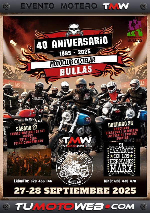 El sábado 27 y domingo 28 de septiembre 2025, la Peña Mototorista Castelar celebra el 40 Aniversario de su conocida Concentración Motorista en Bullas (Murcia).