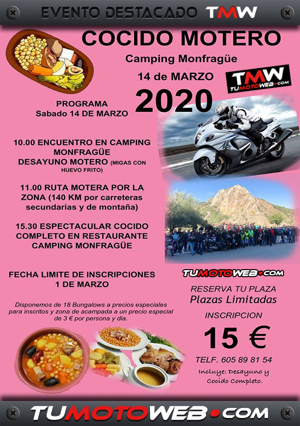 Sábado 14 de Marzo: 10:00h Encuentro en el Camping Monfragüe. Desayuno motero (migas con huevo frito). 11:00h Ruta motera por la zona (140 kms por carreteras secundarias y de montaña). 15:30h Espectacular cocido completo en Restaurante Camping Monfragüe. Una buena excusa para disfrutar de un fantástico día de convivencia motera en el Norte de Extremadura. ¿Te lo vas a perder?