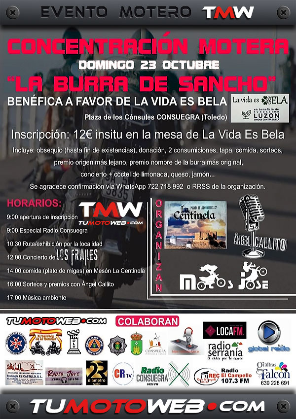 La Concentración Motera La Burra De Sancho es un evento motero benéfico a favor de La Vida Es Bela y Fundación Luzón (estudio de la enfermedad de ELA). Os esperamos a tod@s por una buena causa el 23 de Octubre 2022, en Consuegra (Toledo). Lo pasaremos Genial..!!