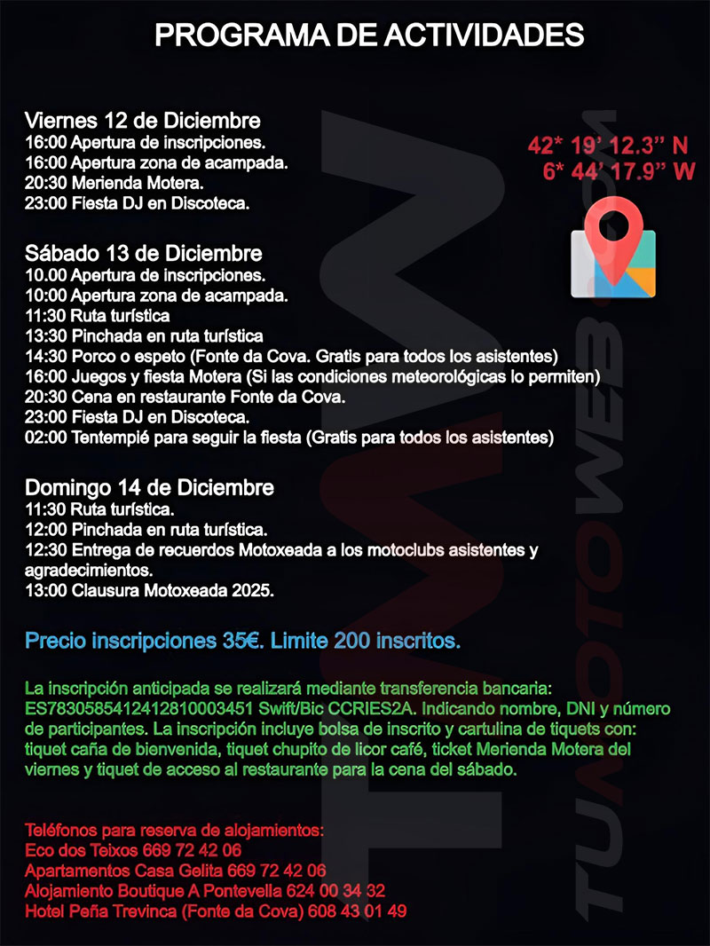 Desde el viernes 12 al domingo 14 de diciembre 2025, el Colectivo Motero Balas Rasas organiza la Concentración Motorista Invernal MOTOXEADA en Fonte Da Cova (Casaio – Ourense).