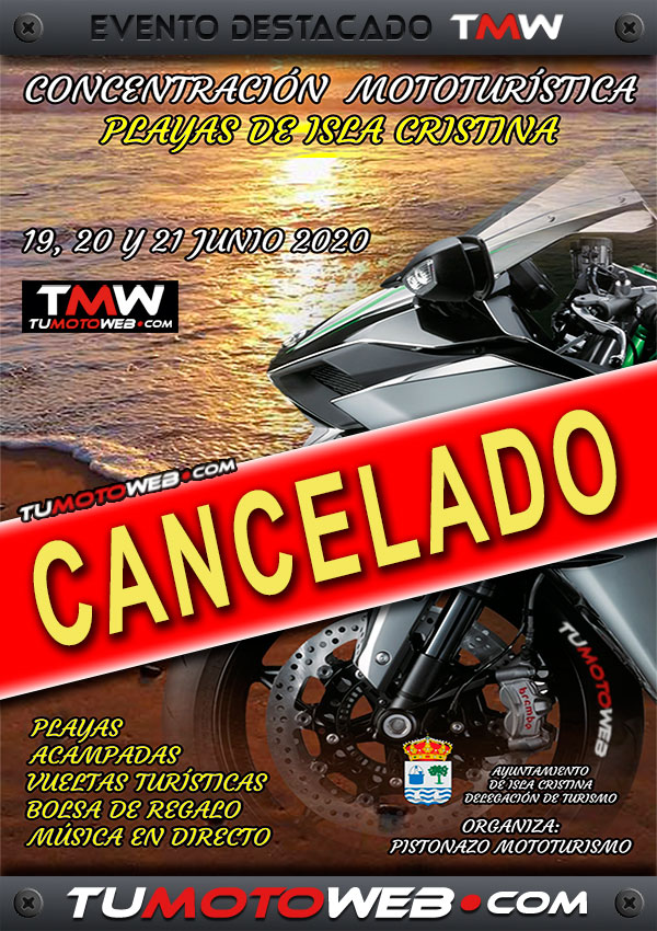 El MotoClub Pistonazo Mototurismo ha comunicado a Tumotoweb.com que la Concentración Mototurística Playas de Isla Cristina 2020, prevista celebrarse del Viernes 19 al Domingo 21 de Junio 2020 en el Parque Central de Isla Cristina (Huelva), ha sido CANCELADA de manera definitiva.