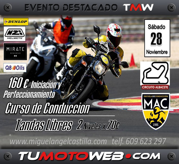 El curso de iniciación y perfeccionamiento incluye: 6 tandas (2 de 20 min. y 4 de 25 min.). Varios niveles, desde iniciación a perfeccionamiento. Cada grupo tendrá 1 Monitor profesional exclusivamente para ellos. Briefing de seguridad curso de conducción. Clase teórica sobre funcionamiento y uso de frenos. Ejercicios prácticos sobre el uso de frenos. Clase teórica sobre trazada de curvas y posición de conducción. Comida y bebida. Grabación de video on-board y corrección individualizada. 1 Clase práctica en exclusiva con Miguel A. Castilla.