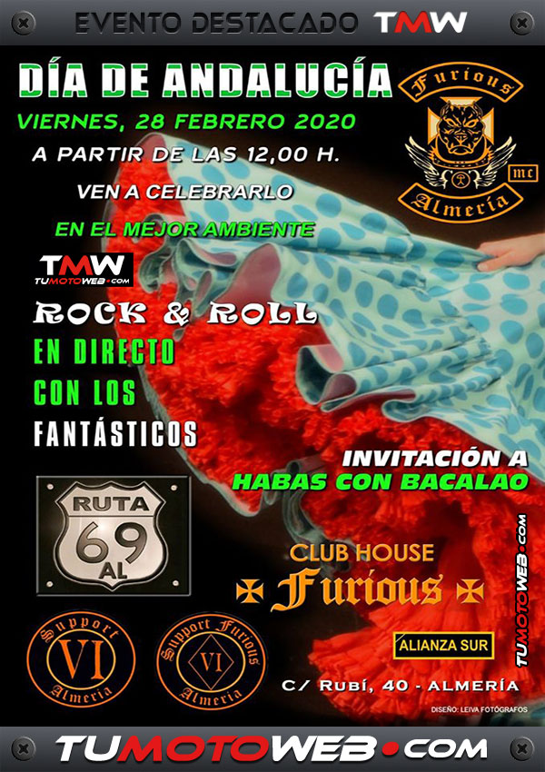 Viernes 28 de Febrero: 12:00h Inicio de la Fiesta Día de Andalucía 2020. Habas con bacalao gratis para todos los asistentes, hasta agotar existencias. Rock & Roll en directo a cargo de Los Fantásticos. Ven a celebrar el día de Andalucía con el mejor ambiente biker. Os esperamos en el Club House Furious MC (Almería). ¿Te apuntas?