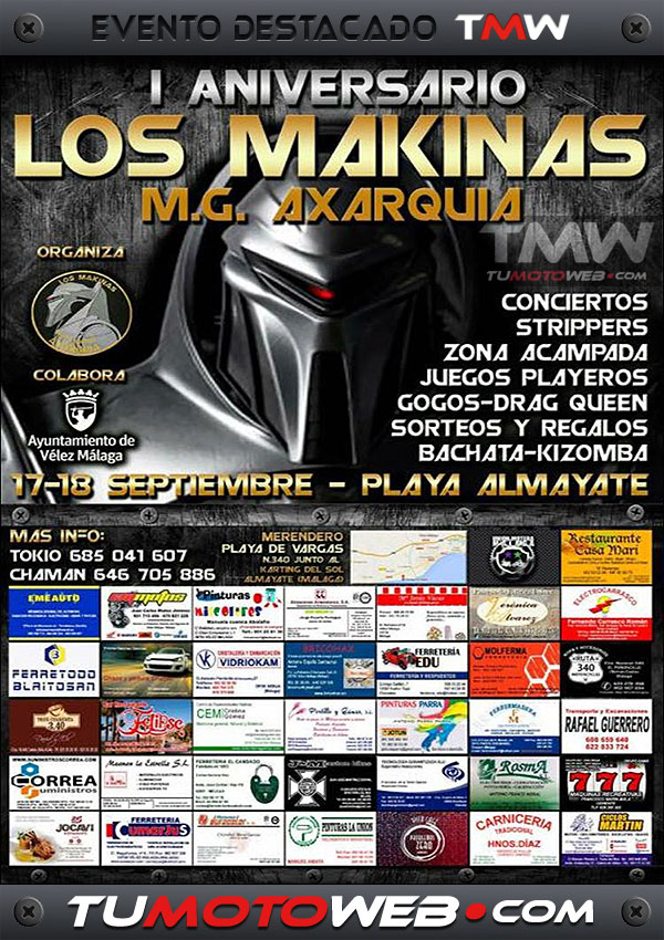 Fin de semana 17 y 18 de Septiembre: Los Mákinas M.G. Axarquia celebramos nuestro I Aniversario y queremos compartirlo con todos vosotros en la Playa de Almayate (Málaga). Tendremos zona de acampada, conciertos en directo, strippers, juegos playeros, go-go’s, drag-queen, bachata-kizomba, sorteos y regalos. Os esperamos..!!