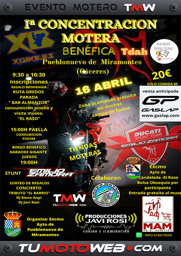 Os esperamos en Pueblonuevo de Miramontes para disfrutar del mejor ambientazo motero, en una Concentración Motera Benéfica a favor de la Asociación Jóvenes Titanes, dedicada a niñ@s y jóvenes con TDAH (Trastorno por Déficit de Atención e Hiperactividad). Que no te lo cuenten..!!