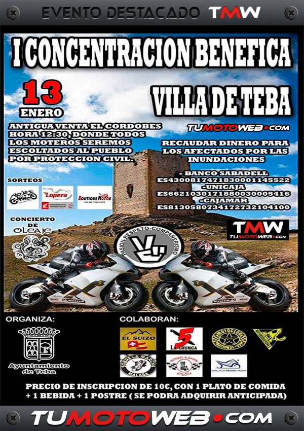 Domingo 13 de Enero: 12:30h Encuentro en la antigua Venta El Cordobés. Desde allí partiremos en ruta escoltados por la Protección Civil de Teba, hacia la explanada Poeta Miguel Hernández (Teba – Málaga), donde habrá servicio de barra, sorteos de regalos y la actuación en directo a cargo del grupo local de rock Oleaje. Concentración motera benéfica para ayudar a los damnificados por las lluvias que azotaron la localidad de Teba el pasado mes de Octubre 2018. Si te apasionan las motos, no olvides apuntar este día en tu agenda. Participa y colabora..!!