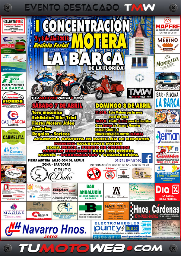 Domingo 8 de Abril: 11:00h Ruta motera por la zona rural de Jerez. 14:00h Paella gratis para los inscritos, gran sorteo de cascos y guantes,. Concentración de motos clásicas. Os esperamos a todos en La Barca de la Florida..!!