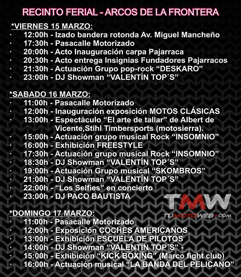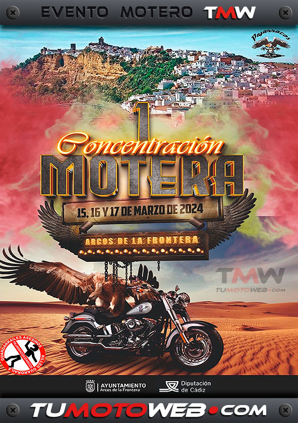 Desde el viernes 15 al domingo 17 de marzo 2024, el MotoClub Pajarracos D’Arcos organiza su I Concentración Motera en Arcos de la Frontera (Cádiz).