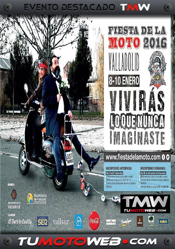 Sábado 9 de Enero: 09:00h Apertura Feria de Día Motera (APEH), zona de patrocinadores y zona de venta de productos para moteros. Desayuno motero (inscritos) | Antigua Hípica Militar. 11:00h Desfile de motos entre Hípica Militar y Acera de Recoletos. Organiza Policía Municipal de Valladolid | Antigua Hípica Militar. 12:00h Exhibición acrobática (Show de Emilio Zamora y Angel Cuadrado) | Zona Campo Grande. Desde las 12:00h Guiso de Bienvenida (inscritos)(APEH) | Estación Gourmet. 12.00-14.00 y 17.00-20.00 Actividades de promoción de la seguridad vial. Actividades para familias. Exposición de motos antiguas y Circuito infantil | Cúpula del Milenio. Desde las 13.00 Ruta de Tapeo Motero | Toda la ciudad de Valladolid. 19:00h Desfile de motos en homenaje a víctimas de accidentes 2015 (salida Plaza Mayor). Organiza Policía Municipal de Valladolid | Plaza Mayor. Desde las 20:00h Caldo Motero (inscritos) | Antigua Hípica Militar. 21:00h Gran concierto nocturno “Valladolid Capital Motera” – Ayuntamiento de Valladolid | Antigua Hípica Militar: Mago de Oz + Carlos Jean + Óscar de Rivera + Danza Invisible + Los Extraños.