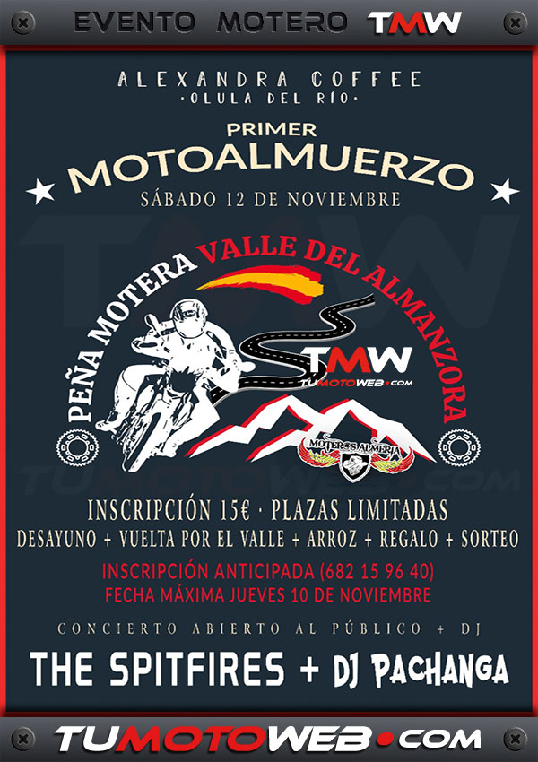 9:00h Apertura de inscripciones. Desayuno. Salida ruta motera por el Valle del Almanzora. Regreso. Comida. Concierto abierto al público a cargo de The Spitfires. Animación con Dj Pachanga. Sorteo de regalos.