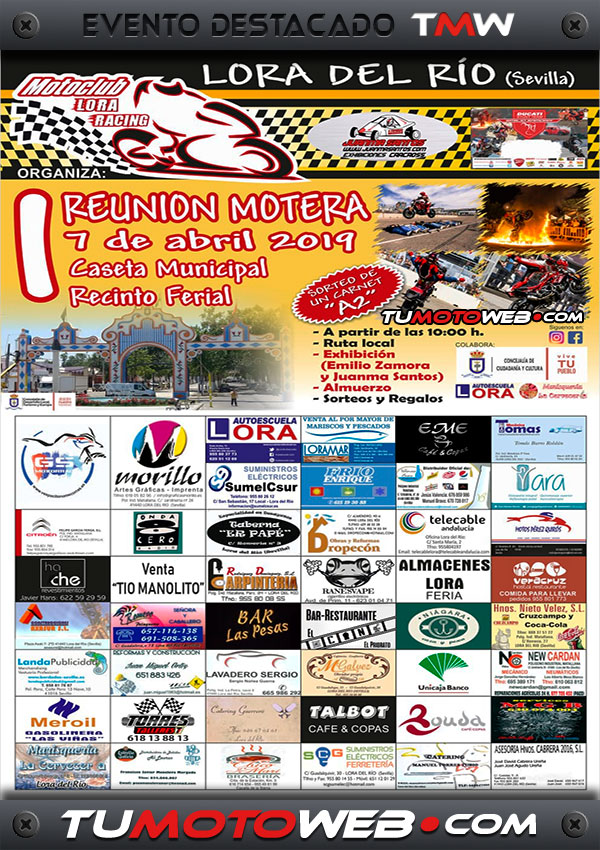 Domingo 7 de Abril: 10:00h Apertura de inscripciones (10 €), la cual incluye mochila regalos, camiseta del evento, 2 consumiciones, plato de comida, número para el sorteo y algún regalillo más. 12:00h Ruta local. 13:00h Exhibición Juanma Santos. 14:15h Comida (plato de arroz con pollo). 15:00h Exhibición Stunt a cargo de Emilio Zamora. 16:15h Sorteos de regalos y entrega de trofeos. 17:30h Fin de fiesta. Os esperamos a todos en Lora del Río. ¿Te lo vas a perder?