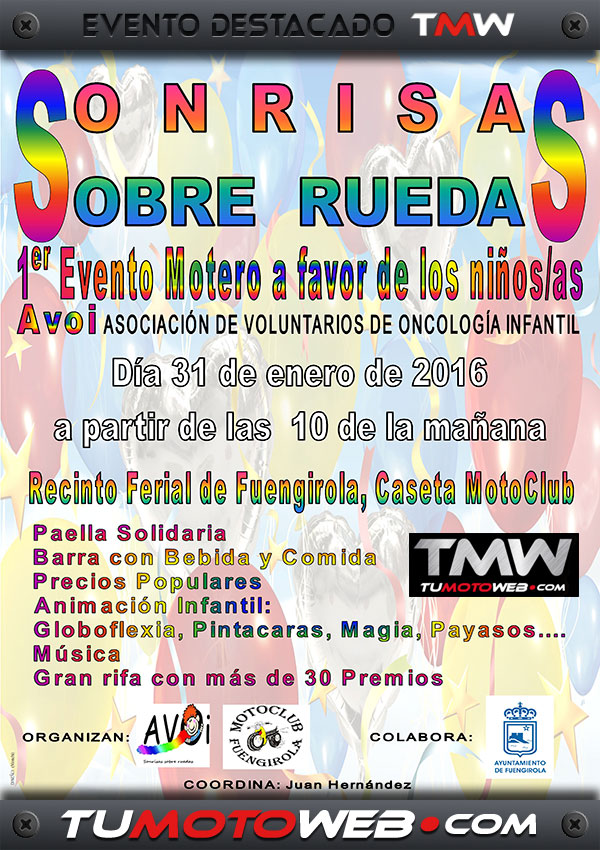 Este primer evento motero solidario se realiza a favor de los niños/as de la Asociación de Voluntarios de Oncología Infantil (AVOI). El evento no tiene coste de inscripción, solo tendríais que pagar lo que consumierais en comida y bebidas. Ofrecemos la posibilidad de comprar papeletas para participar en la rifa. Precios populares. Os esperamos en Fuengirola..!!