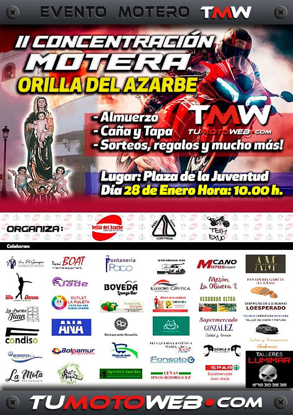 El domingo 28 de enero 2024 a partir de las 10:00h de la mañana, la Comisión de Fiestas Orilla del Azarbe, Peña Motera Raya Continua y Team Exup organizan la II Concentración Motera en Orilla del Azarbe (Murcia).
