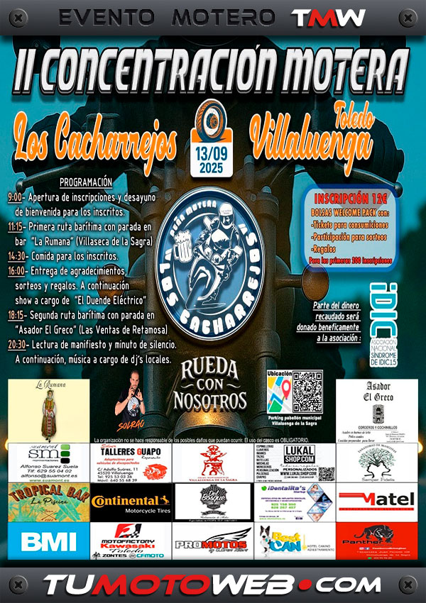 El sábado 13 de septiembre 2025, la Peña Motera Los Cacharrejos organiza su II Concentración Motera Solidaria en Villaluenga de la Sagra (Toledo).