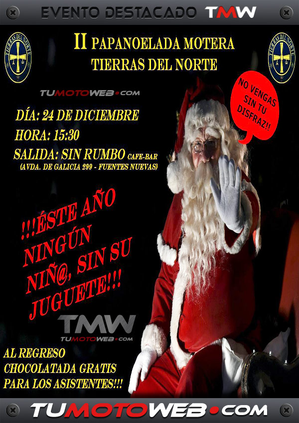Sábado 24 de Diciembre: 15:30h Salida Papanoelada motera recorriendo las calles de nuestra ciudad, salvo con una variante; tod@s aquell@s moter@s que queráis participar, podéis traeros con vosotros un juguete nuevo que queráis donar, para entregárselo a aquellos niñ@s que no tienen posibilidad de disfrutar de ellos habitualmente.