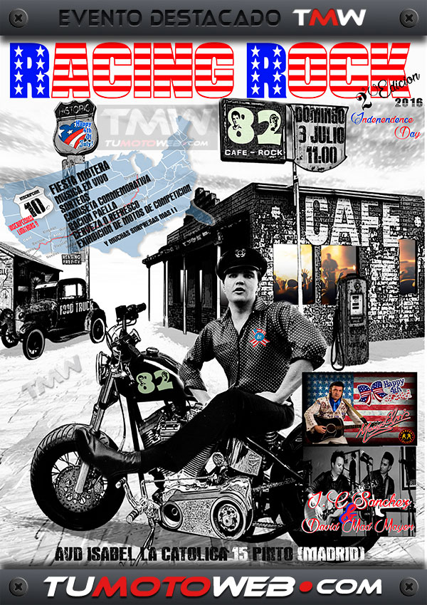 Domingo 3 de Julio: 11:00h Vive junto con la mejor compañía una Fiesta Motera por todo lo alto. Música en directo de la mano del inigualable Marcos Elvis y su peculiar tributo al Rey. También contaremos con el famoso JC Sánchez y su increíble voz que vendrá acompañado de David Mad Mayer, y nos deleitaran con su inmejorable Rock. Fenomenal encuentro biker, paella, regalos, sorteos, exhibición motos de competición, increíbles coches, camiseta conmemorativa, food truck con hamburguesas, perritos calientes, deliciosos gofres. Todo esto y muchas sorpresas más te esperan en el II Racing Rock 82 Happy 4th of July 2016..!!