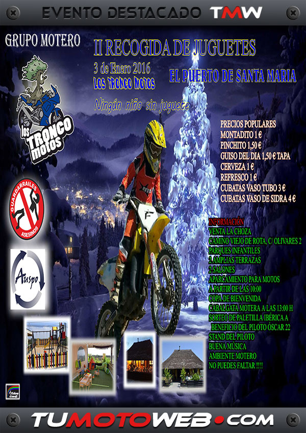 Domingo 3: A partir de las 10:00h copa de vino de bienvenida, a las 13:00h cabalgata motera por la ciudad con los Reyes Magos, parada en la Plaza de España para que los Reyes tiren los caramelos. Sorteo cesta de navidad a favor del piloto portuense Oscar 22, que incluye: dos botellas de vino, 2 piezas de chorizo, 1 paleta ibérica y 2 bonos de hotel gratis para 2 personas/2 noches. Stand de nuestro piloto, buena música, precios populares, 2 amplias terrazas, 2 parques infantiles para los peques, aparcamiento privado solo para motos en la misma venta. No olvides traer tu juguete. Te esperamos..!!