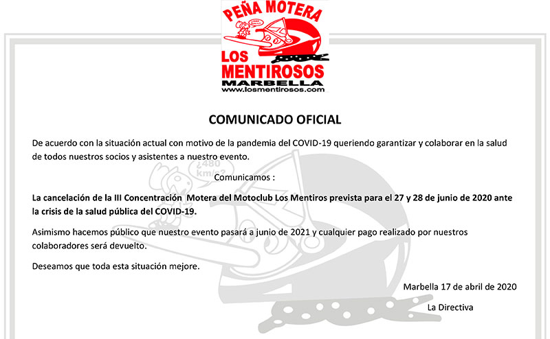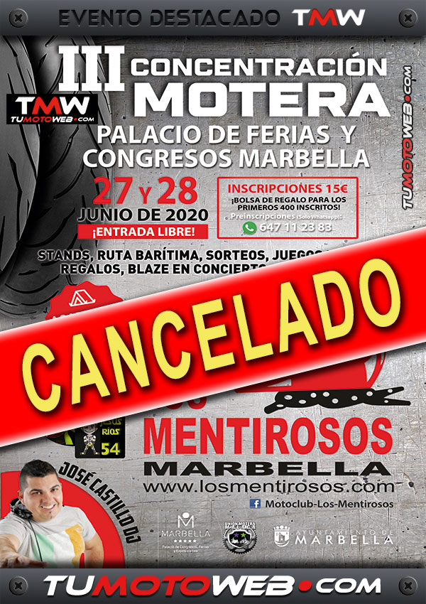 El MotoClub Los Mentirosos ha comunicado a Tumotoweb.com que la III Concentración Motera Los Mentirosos 2020, prevista celebrarse el Sábado 27 y Domingo 28 de Junio 2020 en el Palacio de Ferias y Congresos de Marbella (Málaga), ha sido CANCELADA de manera definitiva.