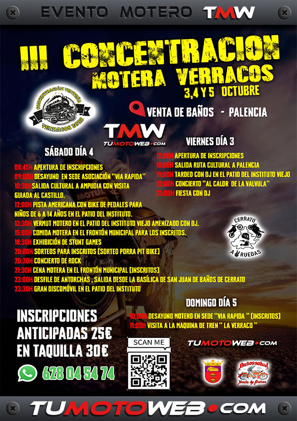 Del viernes 3 al domingo 5 de octubre de 2025, la Asociación Moto-Deportiva Cultural Cerrato A Dos Ruedas organiza la III Concentración Motera Verracos en Venta de Baños (Palencia).