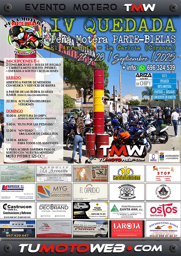 El sábado 27 y domingo 28 de septiembre 2025, la Peña Motera Parte Bielas organiza su IV Quedada Motera en El Arrecife (La Carlota – Córdoba).