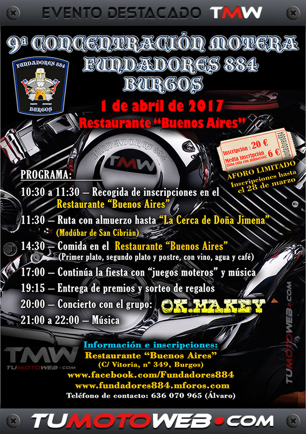 Sábado 1 de Abril: 10:30h a 11:30h Recogida de inscripciones en el Restaurante Buenos Aires. 11:30h Ruta con almuerzo en Restaurante La Cerca de Doña Jimena (Modúbar de San Cibrián). 14:30h Comida en el Restaurante Buenos Aires. (primer plato, segundo plato y postre, vino y agua y café). 17:00h Continúa la fiesta con juegos moteros y música. 19:15 Entrega de premios y sorteo de regalos. 20:00h Concierto en directo con el grupo OK Makey. 21:00h a 22:00h Sigue la fiesta con música.