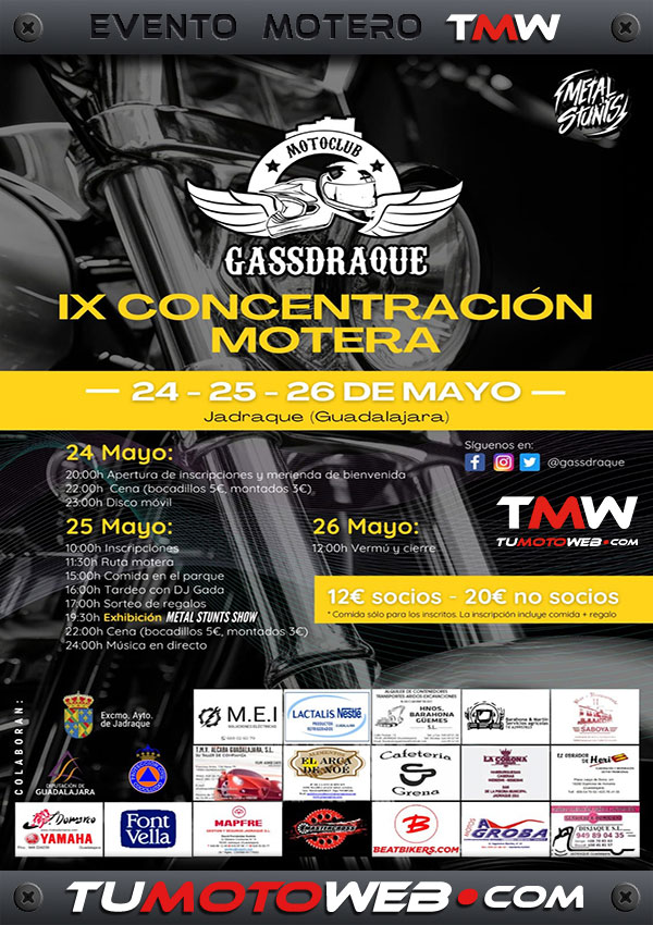 Desde el viernes 24 al domingo 26 de mayo, el MotoClub Gassdraque organiza con la colaboración del Excmo. Ayuntamiento de Jadraque la IX Concentración Motera Gassdraque 2024.