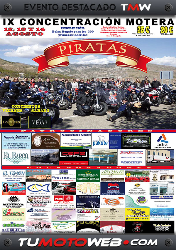 Sábado 13: Apertura de inscripciones, bolsa regalo para los primeros 300 inscritos (camiseta, pin, etc.), ruta barítima, juegos moteros, bocadillo plancha el sábado noche y concierto en directo a cargo de Las Vegas.