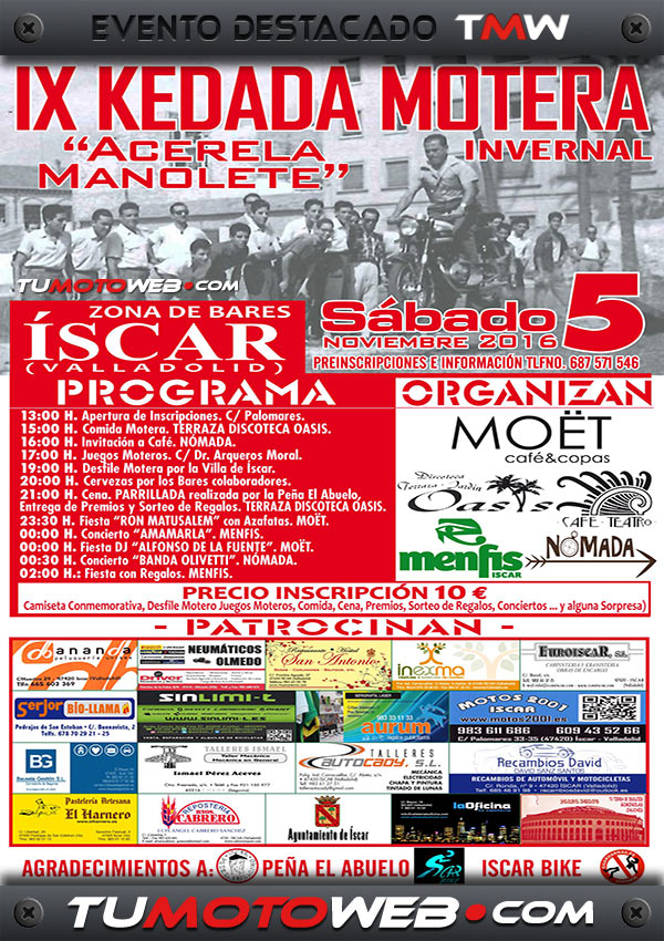 Sábado 5 de Noviembre: 13:00 H. Apertura de Inscripciones C/ Palomares. 15:00 H. Comida Motera. Terraza Discoteca Oasis. 16:00 H. Invitación a Café. Nómada. 17:00 H. Juegos Moteros. C/ Dr. Arqueros Moral. 19:00 H. Desfile Motero por la Villa de Íscar. 20:00 H. Cervezas por los Bares colaboradores. 21:00 H. Cena. Parrillada realizada por la Peña El Abuelo. Entrega de Premios y Sorteo de Regalos. Terraza Discoteca Oasis. 23:30 H. Fiesta “Ron Matusalem” con azafatas. Moët. 0:00 H. Concierto “Amamarla”. Menfis. 0:00 H. Fiesta D.J. Moët. 0:30 H. Concierto “Banda Olivetti”. Nómada. 2:00 H. Fiesta con regalos. Menfis.
