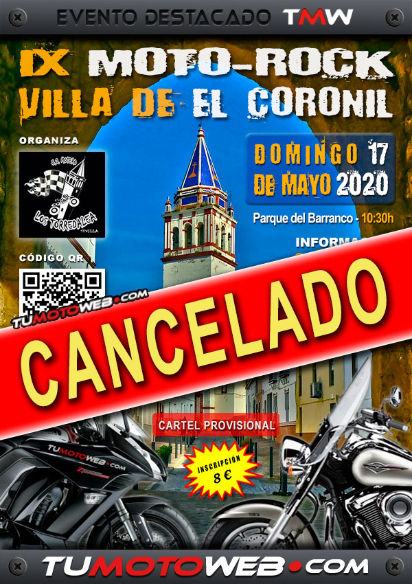 El MotoClub Los Torredaleá ha comunicado a Tumotoweb.com que el IX Moto-Rock Villa de El Coronil 2020, previsto celebrarse el Domingo 17 de Mayo 2020 en el Parque El Barranco (El Coronil – Sevilla), ha sido CANCELADO de manera definitiva.