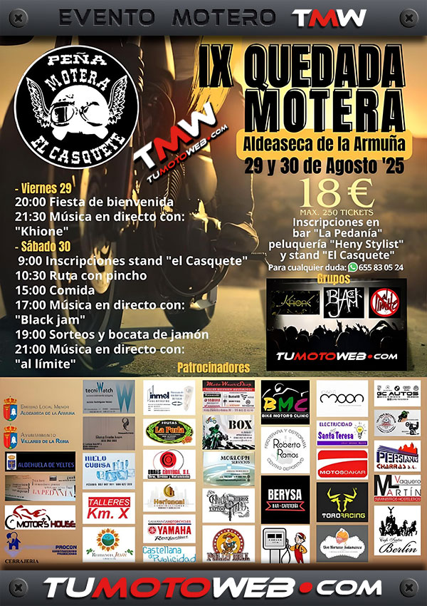 El viernes 29 y sábado 30 de agosto 2025, la Peña Motera El Casquete organiza su IX Quedada Motera en Aldeaseca de la Armuña (Salamanca).