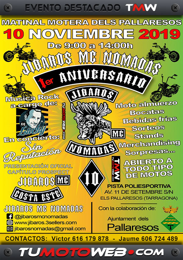 Domingo 10 de Diciembre: 9:00h Ven a celebrar nuestro I Aniversario Jíbaros MC Nómadas y la presentación del Capítulo Prospect Jíbaros MC Costa Este. Tendremos motoalmuerzo, stands, merchandising, bocatas, bebidas, música a cargo de Dj Lucky, concierto a cargo de Sin Reputación, sorteos de regalos, sorpresas y por supuesto mucha birra. Abierto a todo tipo de motos. Os esperamos a todos el 10 de Noviembre en Els Pallaresos (Tarragona).