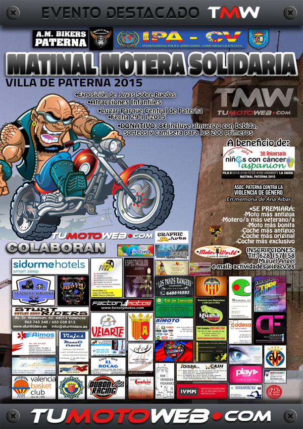 La Matinal Motera Solidaria Villa de Paterna 2015, está organizada por la Asociación Motera Bikers Paterna y por la IPA Comunidad Valenciana.
