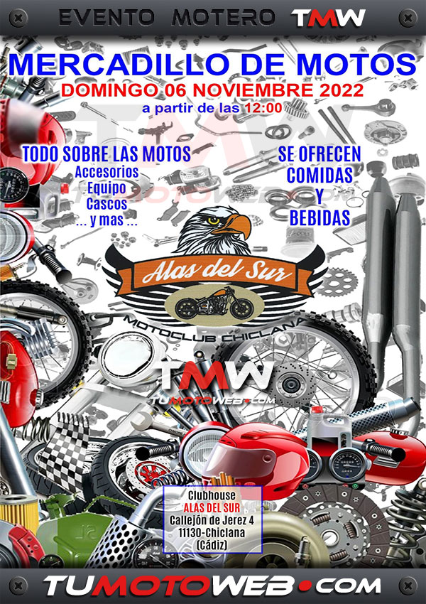 12:00h Apertura Club House Alas del Sur. Entrada libre. Abierto a todo tipo de motos. Mercadillo motero de segunda mano, para todo aquel que tenga en su casa accesorios de moto, prendas moteras, cascos, etc., que quiera ofrecer para su venta o intercambio. Se ofrecerán comidas y bebidas.