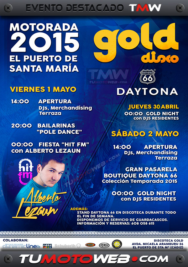 Jueves 30 de Abril: 00:00 Gold Night con Dj’s Residentes. Viernes 1 de Mayo: 12:00 Apertura de puertas Daytona 66, 14:00 Arroz motero, 20:00 Pole Dance, 00:00 Fiesta Hit. Sábado 2 de Mayo: 12:00 Apertura de Puertas Daytona 66, 14:00 Arroz motero, 20:00 Desfiles Daytona 66 Held/Premier y MotoGP, 00:00 Sorteos y regalos.