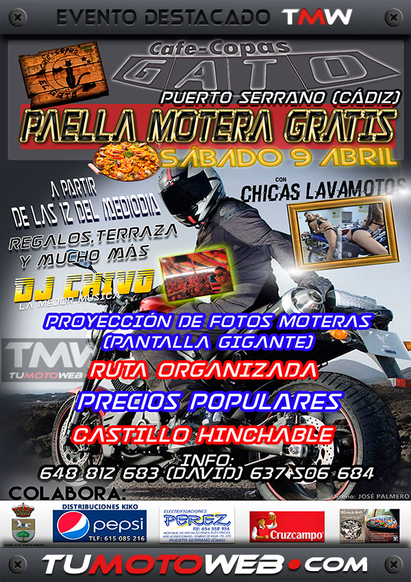 Sábado 9 de Abril: 12:00h Ruta organizada, animación en terraza durante todo el evento con Dj Chivo, espectáculo chicas lavamotos, proyección de fotos moteras en pantalla gigante, castillo hinchable. A partir de las 14:00h paella gratis, sorteo de regalos y mucho más… Precios populares. Os esperamos en Café-Copas El Gato (Puerto Serrano – Cádiz)..!!