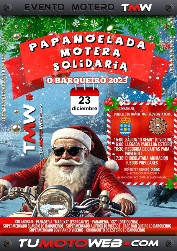 El sábado 23 de diciembre a partir de las 15:00h, el Concello de Mañón y la A.M. Martelos Costa Norte organizan la Papanoelada Motera Solidaria O Barqueiro 2023.