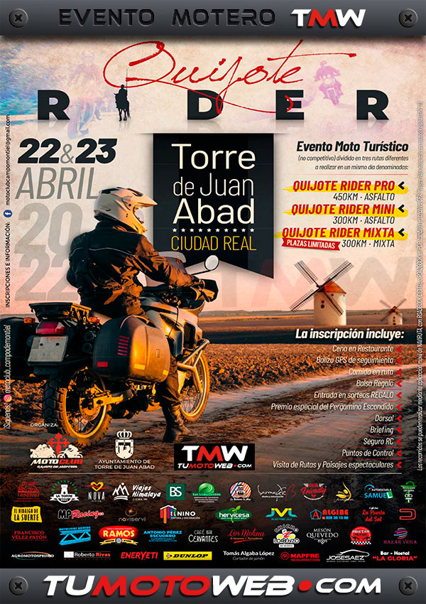 Precios Inscripciones: Quijote Rider Pro: 35 € | Quijote Rider Mini: 35 € | Quijote Rider Mixta: 55 € (incluye TRIPYII) Plazas Limitadas | Acompañante 20 € Extra (almuerzo en ruta, bolsa regalo, camiseta) | Cena en restaurante sábado noche (opcional): 20 € Persona | Inscríbete online para Quijote Rider 2022, hasta el 11-04-2022.