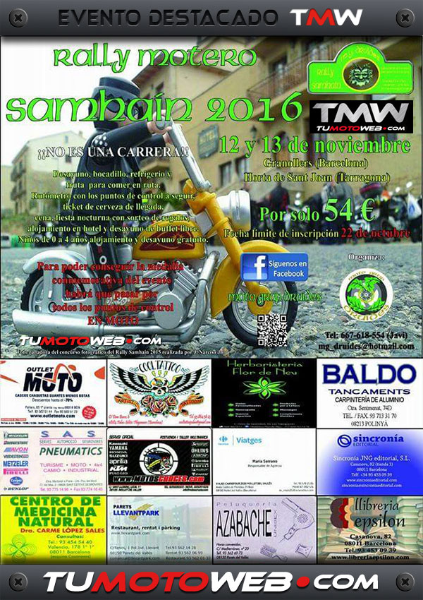 Precio: 54 € por inscrito. Niños de 0 a 4 años alojamiento y desayuno gratis. Fecha límite de inscripciones 22 de Octubre 2016. Nº Cuenta: ES61 0075 1432 04 0600062544. Importante poner nombre y apellido. Para conseguir la medalla conmemorativa hay que pasar por todos los puntos de control en moto. El Rally Motero Samhain no es una carrera. Te esperamos..!!