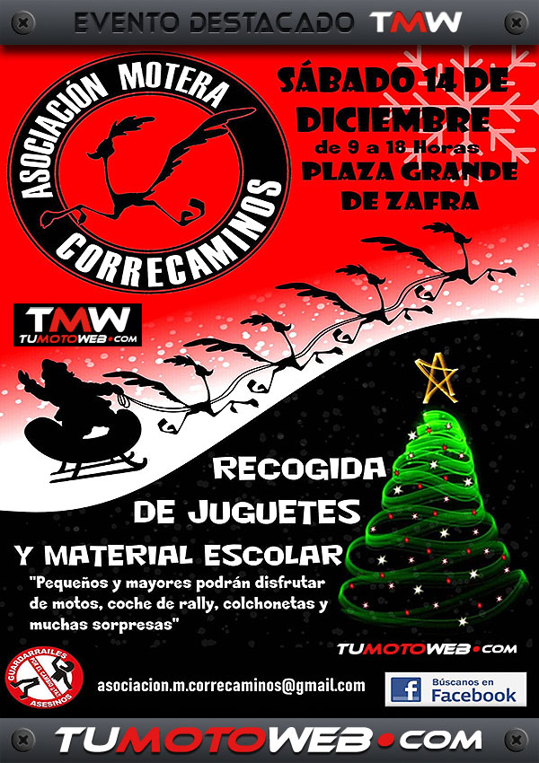 Sábado 14 de Diciembre: 9:00h a 18:00h Estaremos en la Plaza Grande de Zafra para recoger todos los juguetes y material escolar posibles. Pequeños y mayores podrán disfrutar de motos, coche de rally, colchonetas y muchas sorpresas. Incluso contaremos con la presencia de Papa Noel Motero. Os esperamos a todos en Zafra, por una buena causa..!!