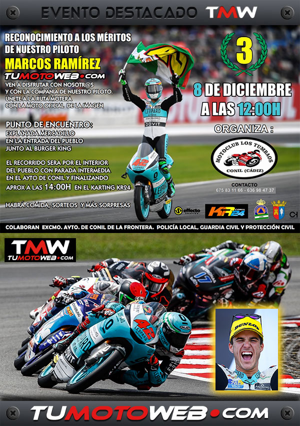 Domingo 8 de Diciembre: 12:00h Quedada motera en la explanada del Mercadillo de Conil de La Frontera (junto al Burguer King). Salida ruta motera por el interior del pueblo acompañando al piloto de Moto3 Marcos Ramírez, que asistirá con su moto oficial. Parada en el Ayuntamiento y finalizaremos la ruta en el circuito de Karting KR24. 14:00h Degustación de menudo para los asistentes (gratuita), sorteos y más sorpresas. Os esperamos a tod@s en este evento de reconocimiento a los méritos de nuestro piloto de Conil de La Frontera. ¿Te lo vas a perder?