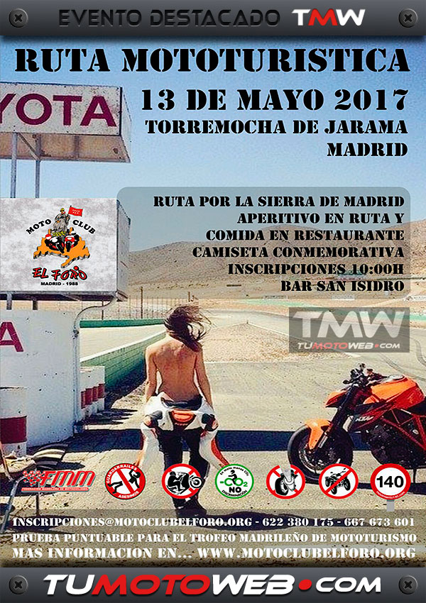 Sábado 13 de Mayo: 10:00h Apertura de inscripciones 20 €. Camiseta conmemorativa, ruta mototurística por la Sierra de Madrid, aperitivo en ruta y comida al finalizar en Restaurante Veracruz (Uceda). Prueba puntuable para el Trofeo Madrileño de Mototurismo. Os esperamos..!!