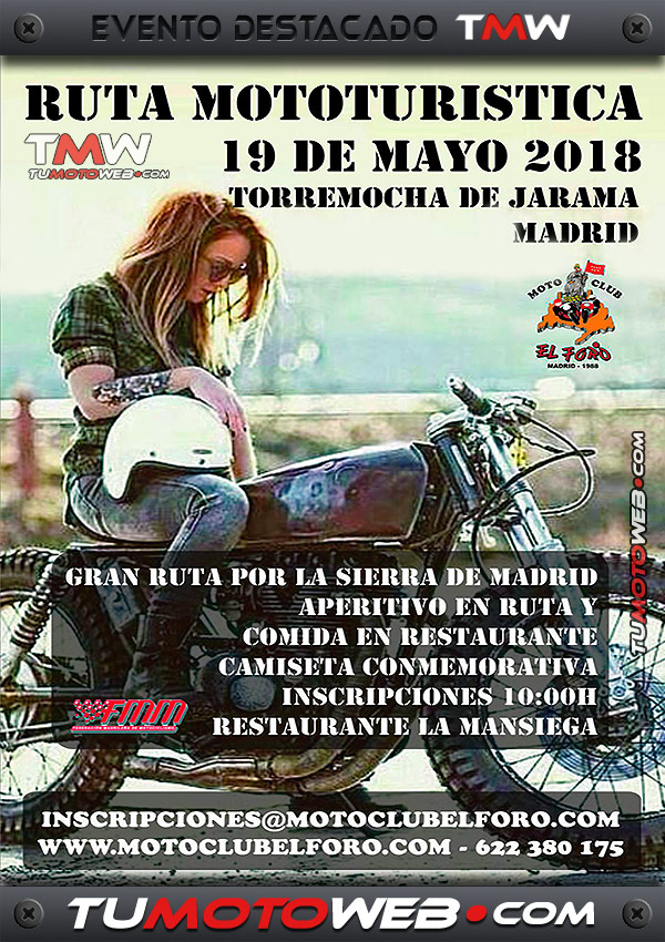 Sábado 19 de Mayo: 10:00h Apertura de inscripciones (20 €). Camiseta conmemorativa, ruta mototurística por la Sierra de Madrid, aperitivo en ruta y comida al finalizar en Restaurante La Mansiega (Torremocha de Jarama). Prueba puntuable para el Trofeo Madrileño de Mototurismo. Os esperamos..!!