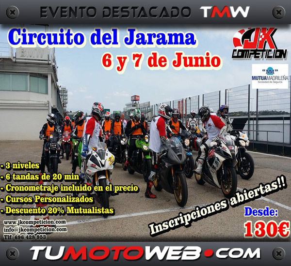 Fin de semana completo en el Circuito del Jarama. Como novedad, este año tendremos cronometraje incluido en el precio para tod@s los pilotos. 3 niveles: Iniciación, Medio y Avanzado. Cada grupo rueda 6 tandas de 20 minutos. Horario: 8.30 h. Apertura formalización de las inscripciones. 9.40 h. Briefing sobre las normas de seguridad. 10:00 h. Apertura de la pista. Horario de 10 a 16 h. Desde 130 € / 240 € Oferta 2 días. Descuento 20% Mutualistas.