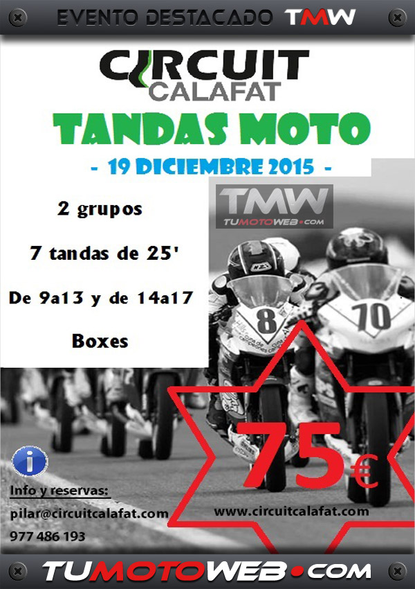 Tandas: 2 Grupos (medios y rápidos) de 20 motos máximo. 7 Tandas de 25 minutos. Boxes compartidos. Precios: Tandas 75 €. Seguro 20 €.
