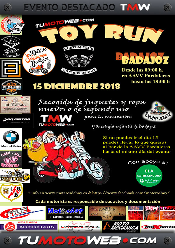 Hay que tener en cuenta que no es necesario tener moto, ni ser motero para acudir al evento, se trata de una iniciativa a favor de los más necesitados, saca tu lado solidario y acude al evento. La idea es hacer ver a los niños que con la entrega de un juguete que ya no utilizan pueden hacer feliz a otro que no puede tenerlo de otro modo. Parte de los juguetes nuevos irán destinados al Banco de juguetes de Oncología Infantil de Badajoz, otra parte de ellos, así como los de segundo uso y ropa, irán destinados a la Asociación Grupo Joven, dicha asociación trabaja con niños en riesgo de exclusión social, y tiene su sede en el barrio de Suerte de Saavedra, Badajoz. En caso de que no puedas acudir el mismo día 15 de diciembre para donar algo, tienes disponible dos puntos de recogida tanto de juguetes nuevos o de segundo uso, como de ropa en: Bar de la AAVV de Pardaleras (frente al centro comercial La Plaza, Badajoz), lugar donde será el evento / Pub The Blues Brothers (C/. Rafael Lucenqui, 9, Badajoz). No lo dudes y saca tu lado solidario, además de acudir a pasar un buen día entre amigos.