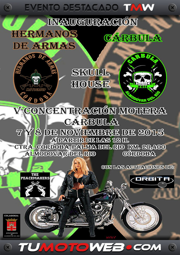 Domingo: Concierto a mediodía a cargo de Peacemaker y Órbita. Música rock/pop. Ruta motera por Almodóvar del Rio. Cervezas a 1€ y copas en vaso ancho a 3,50€. Pintxos, hamburguesas y montaditos. Paellera de arroz para 1000 personas. Os esperamos..!!