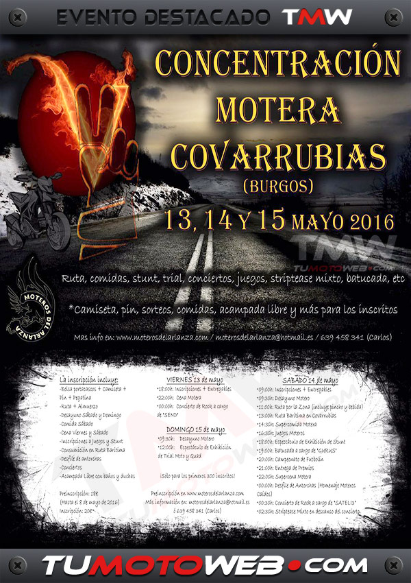 Sábado 14 de Mayo: 9:00h: Inscripciones + Entregables. 09:30h: Desayuno Motero. 11:00h: Ruta por la Zona (incluye pincho y bebida). 13:00h: Ruta Barítima en Covarrubias. 14:30h: Supercomida Motera. 16:30h: Juegos Moteros. 18:00h: Espectáculo de Exhibición de Stunt. 19:00h: Batucada a cargo de “Gurus”. 20:00h: Campeonato de Futbolín. 21:00h: Entrega de Premios. 22:00h: Supercena Motera. 0:00h: Desfile de Antorchas (Homenaje Moteros Caídos). 0:30h: Concierto de Rock a cargo de “Satelit-3″. 2:30h: Striptease Mixto en descanso del concierto.