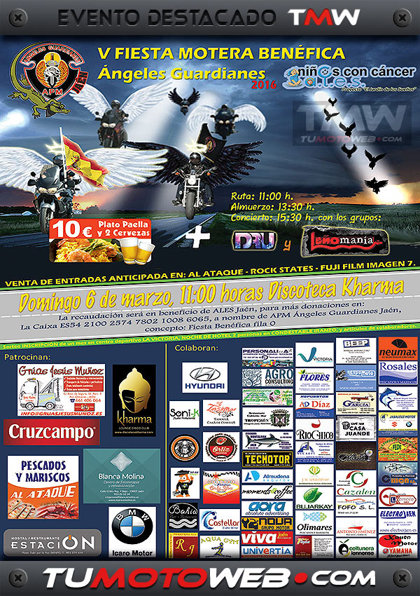 Fiesta motera organizada por la delegación Jaén de APM Ángeles Guardianes, a beneficio de la Asociación ALES de niños con cáncer (Proyecto El Jardín de los Sueños). Venta anticipada de entradas en Al Ataque, Rock States y Fuji Film Imagen 7. Más donaciones en La Caixa: ES54 2100 2574 7802 1008 6065, a nombre de APM Ángeles Guardianes Jaén. Concepto: Fiesta Benéfica Fila 0.