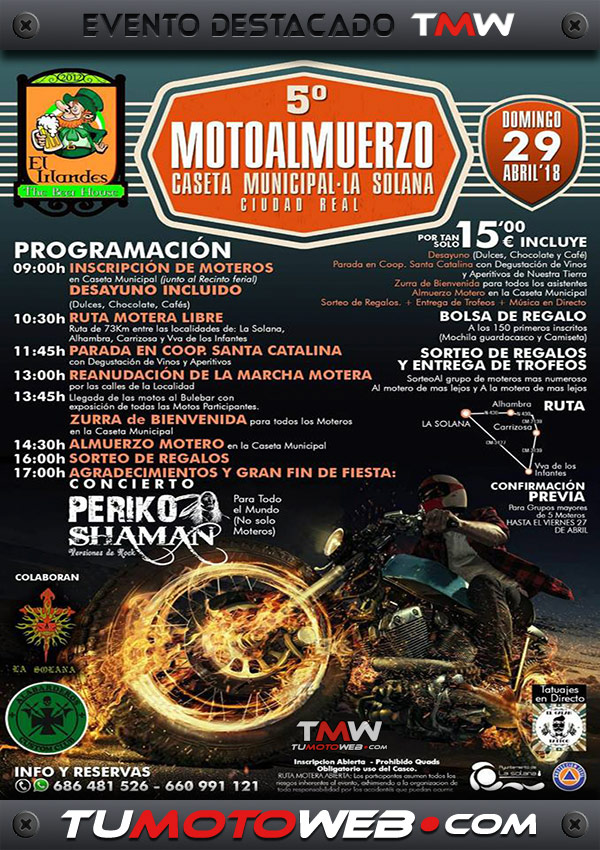 Domingo 29 de Abril: 9:00h Apertura de inscripciones (15 €) en la Caseta Municipal (junto al Recinto Ferial), bolsa de regalo a los 150 primeros inscritos (mochila guardacasco y camiseta), desayuno incluido (dulces, chocolate y cafés). 10:30h Ruta motera libre de 73 kms entre las localidades de La Solana, Alhambra, Carrizosa y Villanueva de los Infantes. 11:45h Parada en la Cooperativa Santa Catalina, con degustación de vinos y aperitivos. 13:00h Reanudación de la marcha motera por las calles de la localidad. 13:45h Llegada de las motos al Bulevar con exposición de todas las motos participantes. Zurra (sangría) de bienvenida para todos los moteros en la Caseta Municipal. 14:30h Almuerzo motero. 16:00h Sorteo de regalos y entrega de trofeos. 17:00h Agradecimientos y gran fin de fiesta con el concierto de Periko Shaman (versiones de rock Pink Floyd, Dire Straits, Led Zeppelin, Free, Queen, Platero, Barricada, etc.). Os esperamos en La Solana..!!